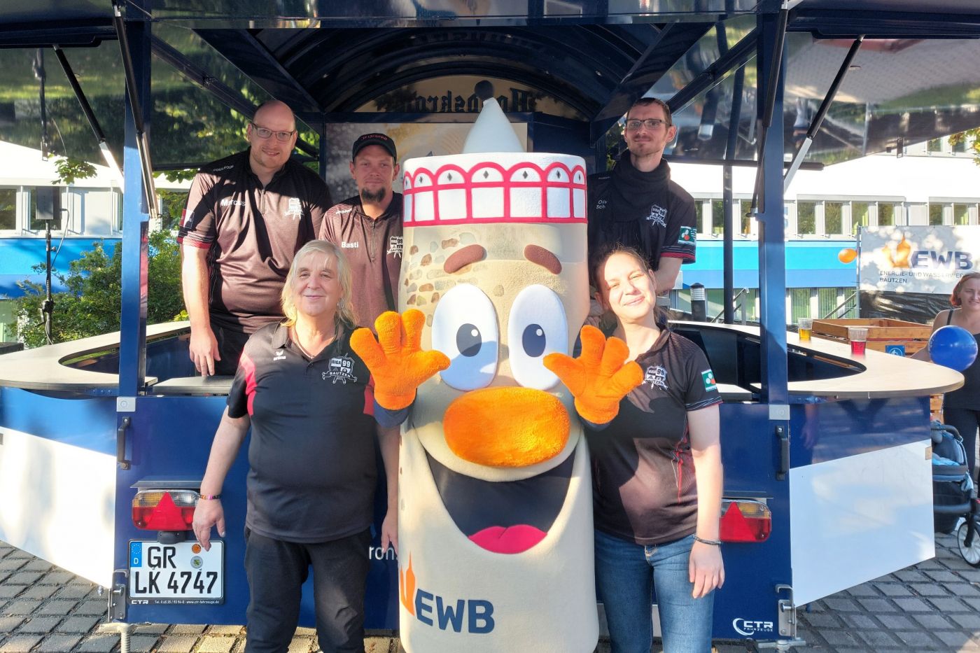 Die fünf Fleißigen vom Getränkewagen mit Maskottchen Wodi beim Jubiläumsfest der EWB