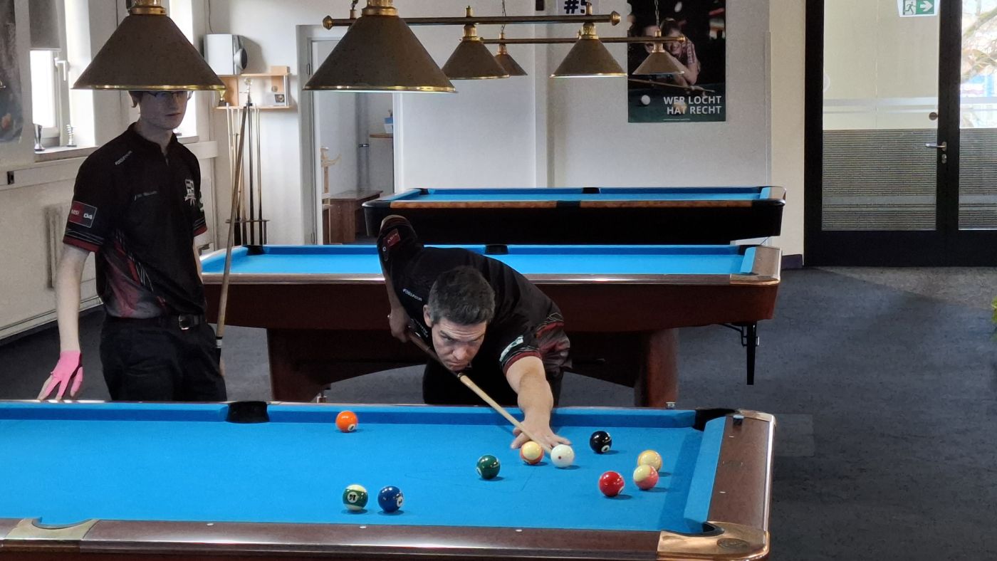 Zwei Runden lang blieb es ausgeglichen, wobei wir leider kein Mittel gegen die beiden stärksten Snoobis Eric Haydt und Christian Dorsch fanden. Mein 14.1 gegen Eric war aber ein Highlight für Landesliganiveau, einzig ein Schnitt von 5,1 Punkten reichte nicht gegen eine starke 38-er Serie von Eric zum Sieg in der 7. Aufnahme. Vor allem Duc mit zwei Siegen gegen Roland Holz und Thomas, sowie Nick und Norbert mit je einem Sieg hielten uns bis zum 4:4 im Rennen. In der dritten Runde aber nahm das Unheil in zwei Thrillern und einer kleinen Überraschung seinen Lauf. Ich musste zum dritten Mal gegen Eric im 8-Ball ran, und war zu ersten Mal bei Hill-Hill und noch vier offenen Kugeln auf dem Tisch nah am allerersten Sieg gegen ihn. Doch eine knapp verschossene längere Kugel und perfekte Stellung für den Gegner später war die Niederlage besiegelt. Dieselbe Chance hatte Norbert gegen Christian im 9-Ball, als er bei 5:5 ein zwar schwere 9 anzugehen hatte, aber auch er brachte es nicht zum positiven Ende. Zuvor kam noch besagter Thomas ins Spiel, der unseren Nick im 4:2 im 10-Ball besiegen konnte und uns somit so gut wie aus dem Rennen für den Aufstieg schoss. Zumindest Duc konnte zum Schluss noch den Ehrentreffer setzen und seine Matchbilanz mit drei Siegen aufpolieren. Aber alles in allem leider ein bitterer Sonntag für die 2. Biga-Mannschaft: Zwar gekämpft bis zum Schluss, aber die Matchpunkte liegengelassen.