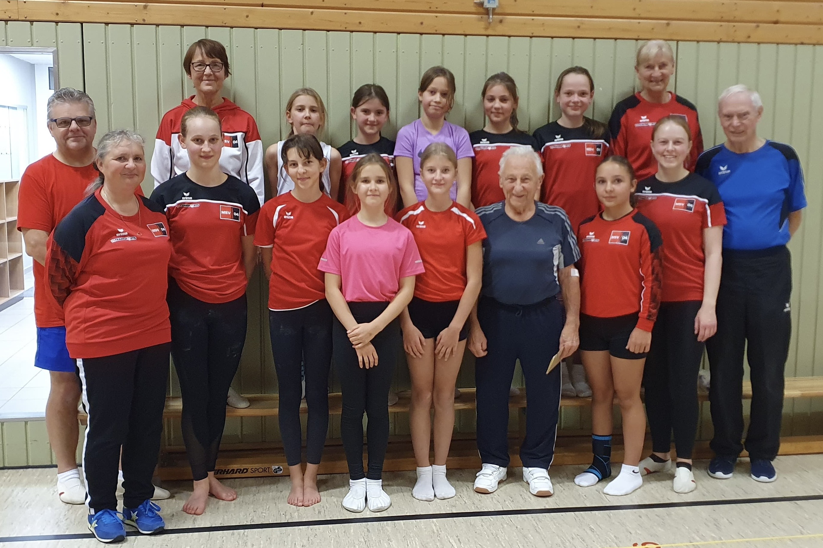 Nachdem letztes Jahr der runde Geburtstag gefeiert wurde, konnten wir dieses Jahr unserem ältesten Trainer Walter Ruben (vorn in der Mitte) zum 91. Geburtstag gratulieren. Seit 1940 ist er im Turnsport aktiv und unterstützt seit über 70 Jahren als Trainer die Turnerinnen und Turner. Auch heute kommt er regelmäßig in die Halle, um den Turnerinnen beim Training an den verschiedenen Geräten Tipps zu geben und sie besonders am Stufenbarren zu fördern. Wir wünschen ihm alles Gute!