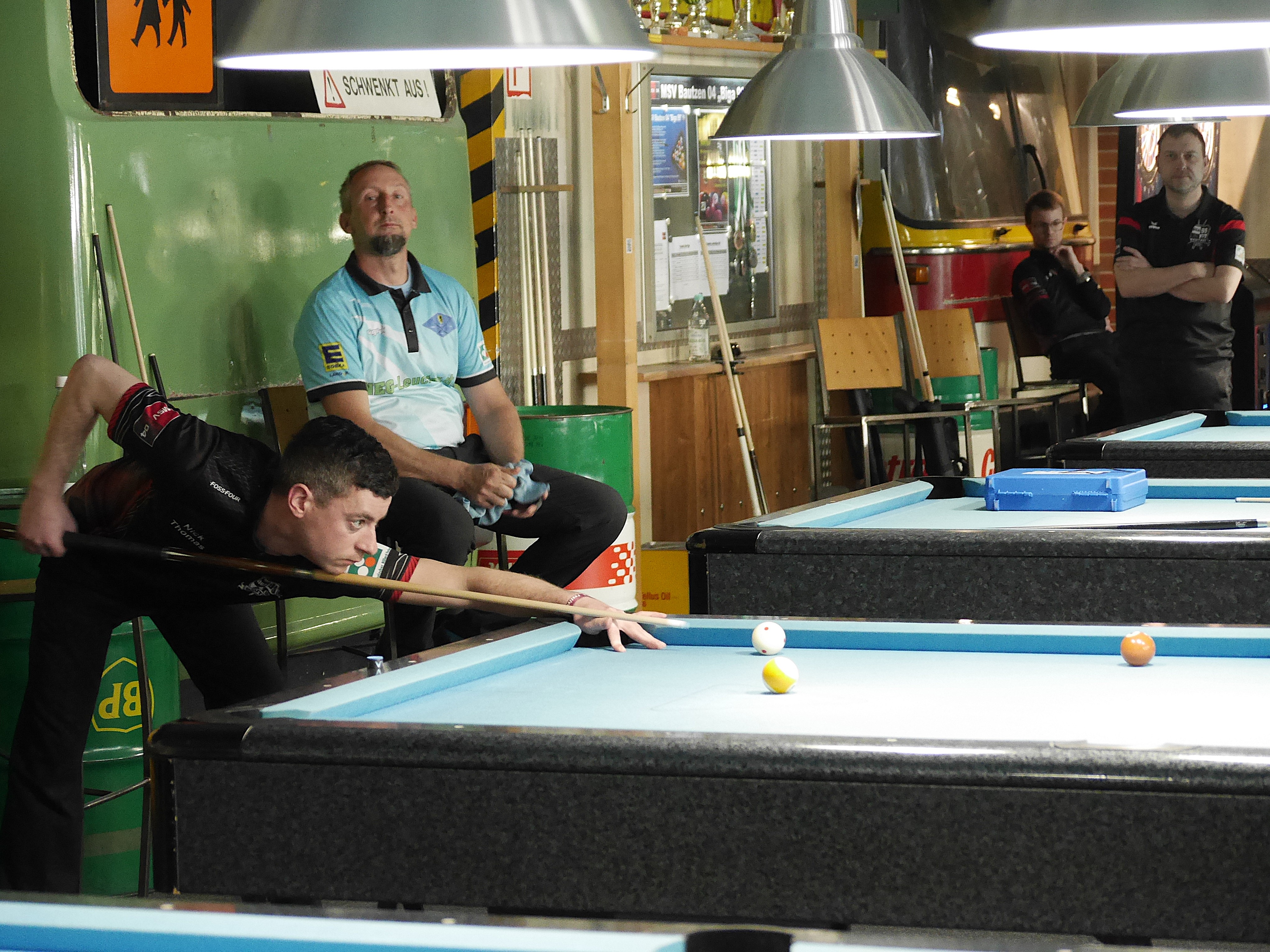 Derweil war unsere 3. Mannschaft mit Robert, Mathias, Marcel und Tom bei unserem direkten Rivalen BC Joes 2 in Dresden zugange. Die Dresdener gaben noch einmal alles und nur Mathias konnte gegen Feras sein 10-Ball für die Bautzener gewinnen.